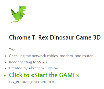 앞서 소개했던 티노디렉스의 3D 버전인데요. 주소창에 https://elgoog.im/t-rex/3d/를 적으면 Click To <<Start the Game>> 글씨를 클릭하여 3D 버전의 게임을 플레이하실 수 있습니다.