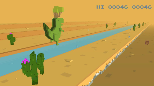 도트 버전의 티노디렉스와 방식은 같습니다. 선인장을 스페이스바를 이용해 뛰어넘으면 되는 데요. 이 버전은 마우스 우클릭도 지원하여 티노디렉스가 엎드리는 자세도 구현하였습니다.