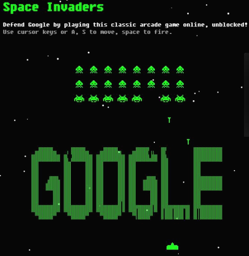 스페이스 인베이더! 이 게임도 추억의 게임입니다. 주소창에 https://elgoog.im/space-invaders/를 적어 게임을 플레이해보세요. 게임은 키보드를 이용하는 데요.