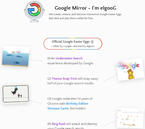 주소창에 https://elgoog.im를 적어 새창을 여는 순간, 나머지 게임들과 구글 검색에 존재하는 다양하고 놀라운 이스터에그들을 경험하실 수 있습니다. 심지어 타노스의 핑거스냅으로 검색 결과를 날려버리는 것도요.