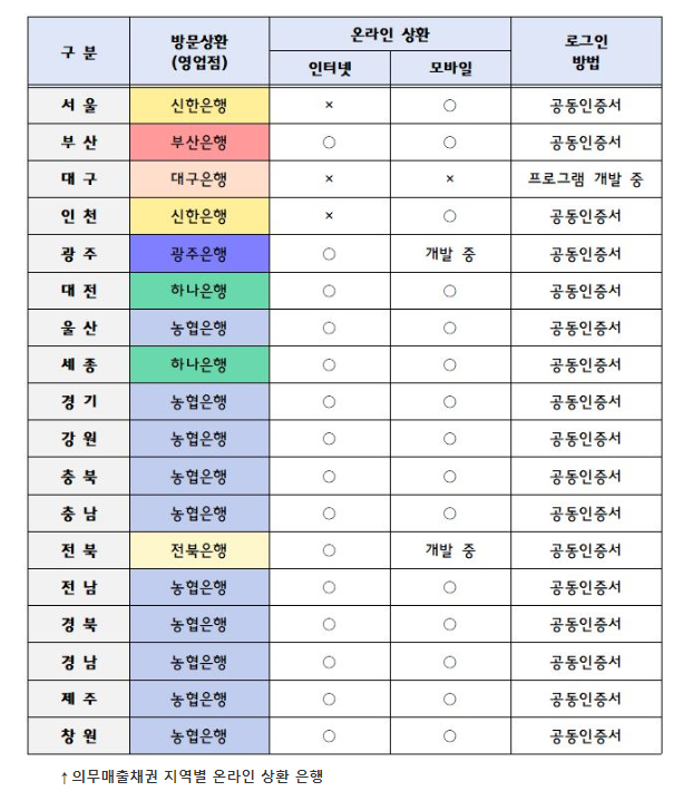 애초 시민이 만기 채권을 환급받기 위해서는 직접 시·도 금고 은행을 직접 방문해서 신청해야 했지만, 이번 3월 2일부터는 금고 은행 홈페이지 및 모바일 앱 등을 이용하여 좀 더 편하고 쉽게 지역개발채권 환급 상환을 받으실 수 있습니다. 다만 대구지역 대구은행은 시스템 정비를 마친 후 상반기 중으로 온라인 상환을 시작할 예정이라고 합니다.