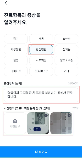 또한 사진도 첨부하면 좋은데, 난 살짝 혈압이 있기에 집에서 막 자가 체크한 혈압 수치와 원래 처방받던 약 이름을 사진으로 찍어 첨부했다. 원래 안 먹어도 되지만 일을 해야 하고 요즘의 불규칙한 생활과 식습관으로 인해 나빠진 내 건강을 위해 어쩔 수 없다.