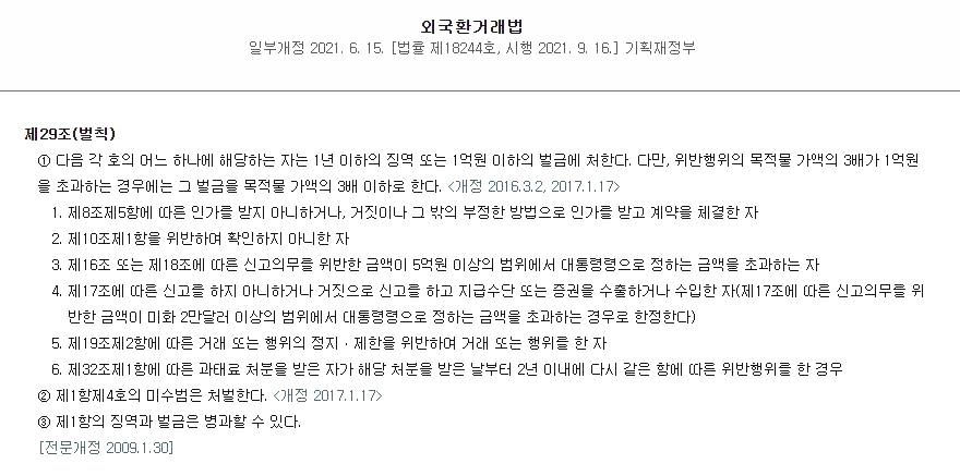 만약 외국환거래법을 위반하면 외국환거래법 27조 (벌칙)에 의거, 최고 5년 이하의 징역 또는 5억원 이하의 벌금에 처할 수 있는데요. 보통사람이 위반할 확률은 거의 없으며, 27조의2 (벌칙)에 의거한 3년 이하의 징역 또는 3억원 이하의 벌금, 28조 (벌칙)에 의거한 2년 이하의 징역 또는 2억원 이하의 벌금이 있지만 여기까지 희대의 사기꾼이나 특별한 경우가 아니라면 이 또한 위반할 요지는 없어 보이는 데요.