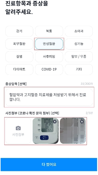 내 입장에선 비대면 진료 앱 사용 전에, 직접 병원을 방문하여 대면 건강검사 진료를 거쳐 확정 처방된 현재 정기적으로 먹고 있는 만성질환 약이라 아무 생각 없이 그냥 무심코 똑같은 약을 처방받길 원해 적은 것 뿐인데..(원래 정기적으로 먹었던 만성질환 약은 달라지면 안된다.) 비대면 진료 앱의 사용이 난생첨인 나에게는 만성질환 약만 처방받는 목적이 있었고, 몸이 아픈 게 아닌데 증상입력에는 무엇을 적어야 할지도 조금 난감했다.