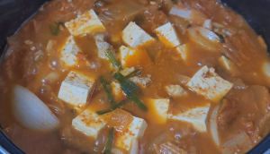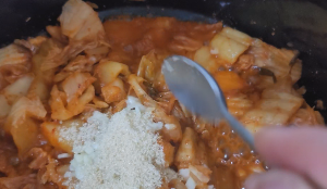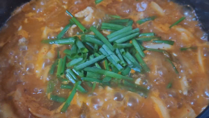 10. 다음은 중불로 불을 줄여 오래 바글바글 끓여 주면 돼지고기 김치찌개 국물의 깊은 맛을 느낄 수 있는데, 마지막은 대파나 쪽파, 또는 두부를 썰어 넣어 마무리하면 된다.