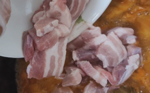 1. 먼저 돼지고기를 준비하는데, 요리전 미리 돼지고기의 핏물을 빼기 위해 찬물에 1시간 정도 잠시 담가 놓는다. 만약 단시간으로 핏물을 제거하고 싶다면 찬물 1L 정도에 설탕 1숟가락을 넣고 고기를 30분간 담가놓는다.