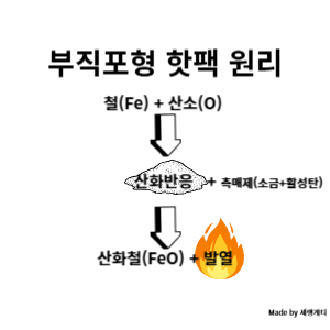 기본적으로 철은 공기와 만나면 서서히 산화반응을 일으켜 열을 발생시키는 데요. 철의 산화가 더 쉽게 되도록 철의 입자를 미세하게 가루를 내고 소량의 물과 규조토, 소금, 탄소가루 같은 활성탄을 첨가하여 철 산화의 촉매제 역할을 이끌어내는데, 이렇게 하면 빠른 산화반응과 열 보존을 용의 하게 만들어줍니다.
