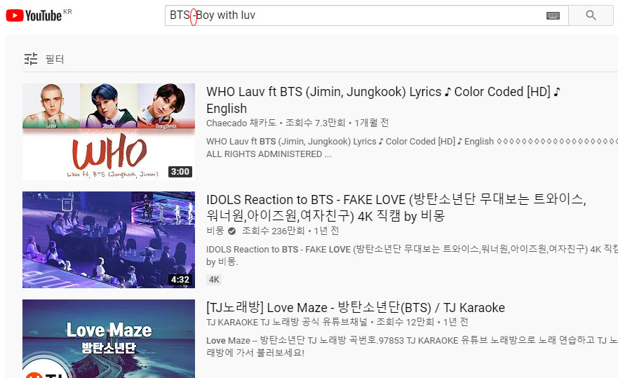 - 하이픈을 이용하여 특정 키워드를 검색에서 제외시킬 수 있는 기능도 있습니다. 예를 들어 'Boy with luv'을 제외한 모든 BTS와 관련된 영상을 찾고 싶다면 검색창에 BTS -Boy with luv (BTS - 사이에 한 칸을 꼭 띄어야 합니다)을 검색하면 아래 스크린샷과 같은 결과가 보입니다. 마찬가지로 +를 검색단어 앞에 사용하면 특정 검색단어를 포함하여 검색을 할 수 있습니다.