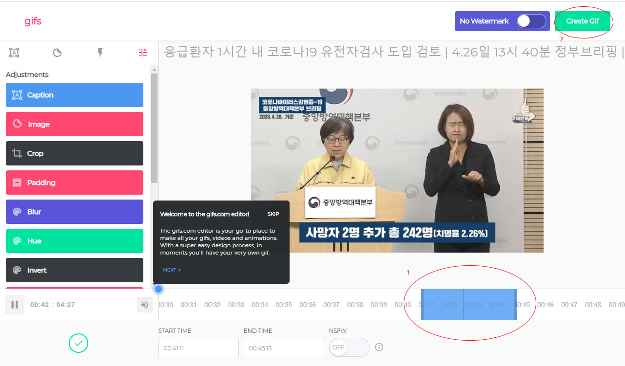 0. 사이트 이동 1. 만들고 싶은 영상 구간 설정 2. 오른쪽 위 Create Gif를 클릭하여 움직이는 파일로 만들기