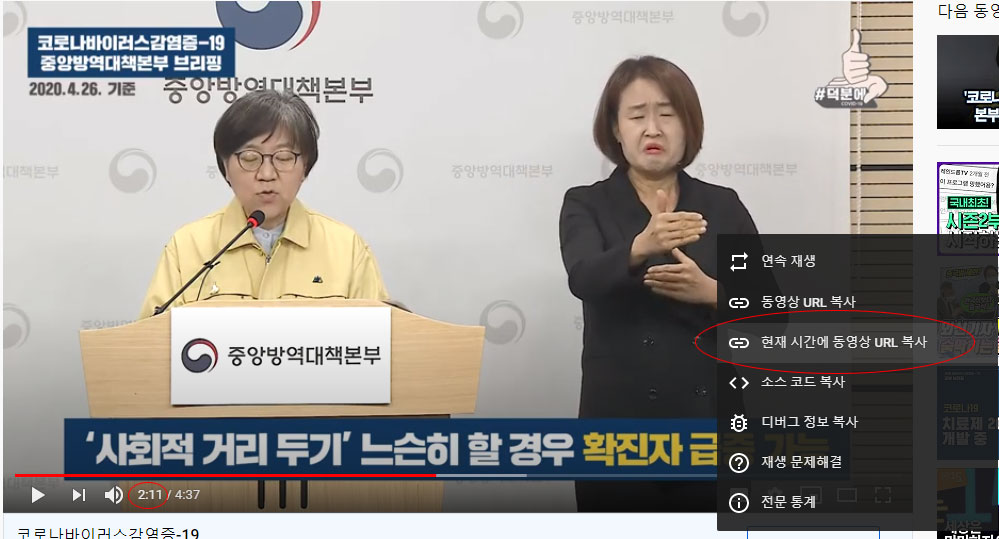 밑에 사진과 같이 만약 2:11초 지점의 영상을 보다가 마우스 오른쪽 버튼을 누르면 메뉴가 뜨는데요. 메뉴 중에 '현재 시간에 동영상 URL 복사'를 누르면 현재 보는 동영상의 2:11초 시간 구간을 상대방에게 공유할 수 있습니다.