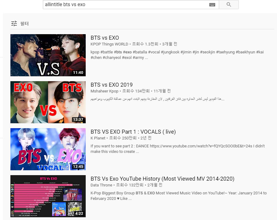키워드를 중심으로 검색하는 유튜브는 원하는 영상이 검색에 나오지 않거나 검색을 하고도 원하는 영상을 찾기 위해 무수히 많은 영상을 넘기며 찾아 헤매어야 할 때가 많은데요. 하지만 검색 첫 부분에 allintitle을 입력하고 검색하면 키워드의 영상들이 조금 더 단순하고 정확하게 검색되어 위의 문제를 조금 해결할 수 있습니다. (정확도는 떨어집니다.)